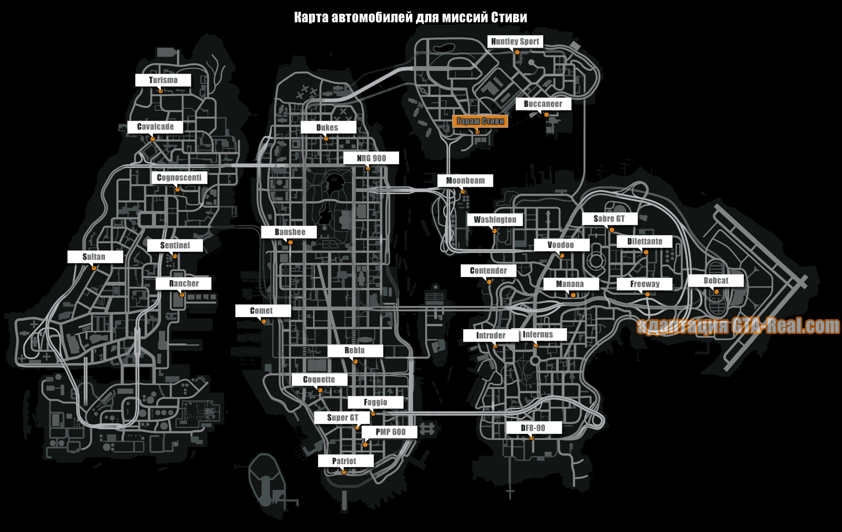 Ниже расписаны все тридцать нужных Стиви транспортных средств. Вы можете найти их в нашем разделе «Транспортные средства GTA 4», с помощью алфавитного рубрикатора в правом верхнем углу. Не используйте коды, иначе миссии за Стива станут бесполезной тратой времени и вы никогда не наберете стопроцентное прохождение в статистике: